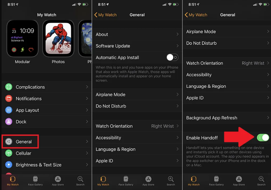 Click “General” in the “My Watch” section. Switch on to activate handoff on your Apple Watch, and then open the Watch app on your iPhone.