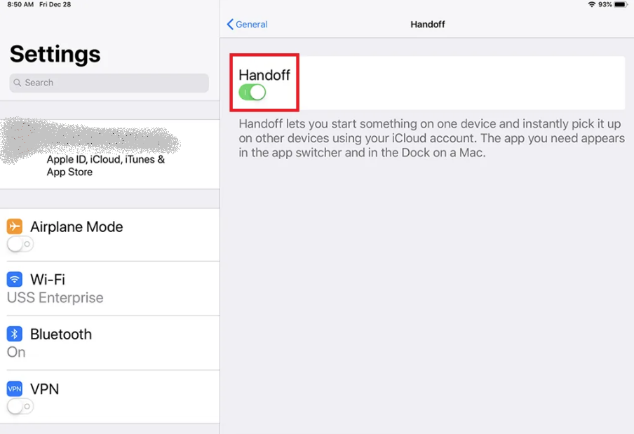On iOS devices, this process is simplified, so you can follow the same process on iPhone and iPad. Go to Settings > General > Handoff on your iOS device. Turn on the handoff switch if it is not already on.