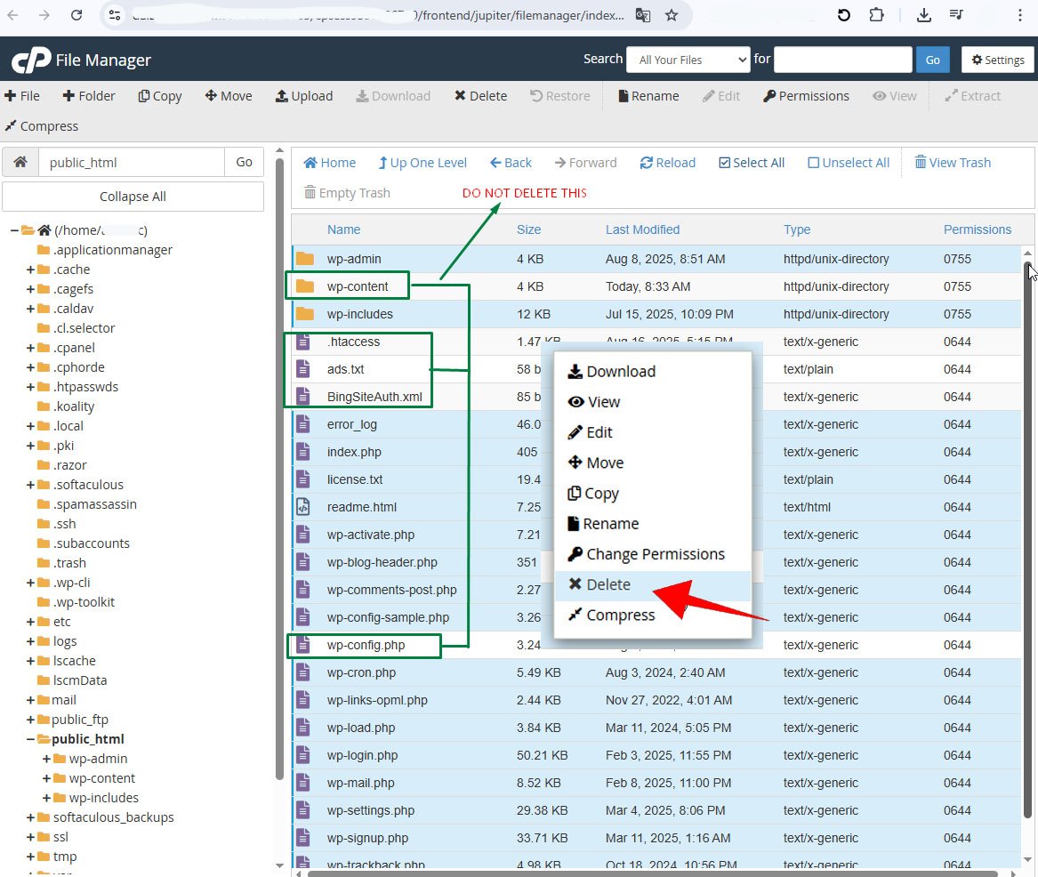 ♦ In File Manager, Delete all files except wp-content and wp-config.php because the wp-content folder contains important files that should not be deleted, consisting of a collection of images/media, plugins, themes, etc., while wp-config.php contains configurations that connect the WordPress core system with your SQL database file.